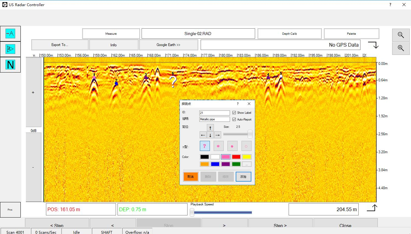 UC25雷達系統可以在任何狀態下對探測數據進行標識,無需暫停、關閉或切換任何界面,直接增加探測點,可編輯點名、屬性說明、顏色、圖例尺寸等信息,方便區分不同目標體信息,極大提高了操作人員工作效率。