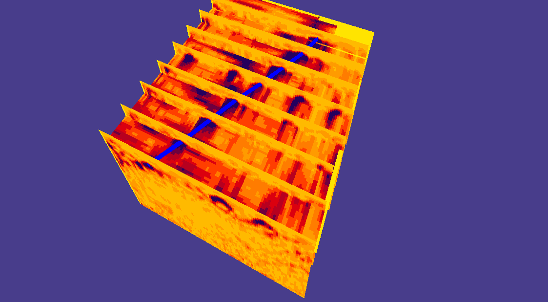 圖3-4:三根管道,2上1下,緊密重疊覆蓋,UC25雷達仍能清晰探測出來,通過軟件算法處理,獲得圖4更加直觀效果。
